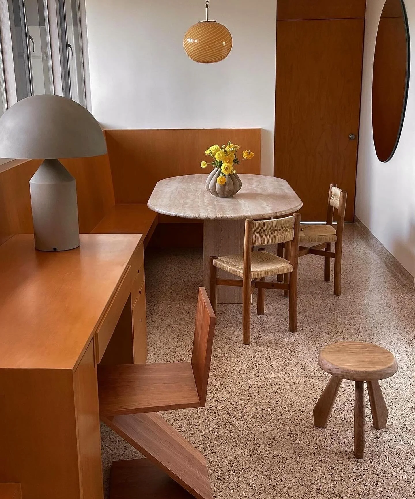 The dining area sits upon the same stunning terrazzo flooring and features a built-in eating space and desk. Hosk added a travertine dining table, Charlotte Perriand dining chairs, a Zig Zag chair by Gerrit Rietveld, an ‘Atollo’ lamp by Vico Magistretti and a Charlotte Perriand style stool.